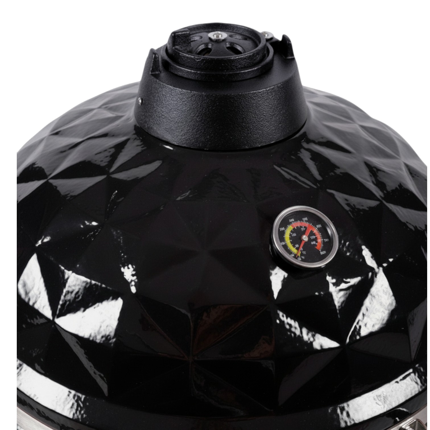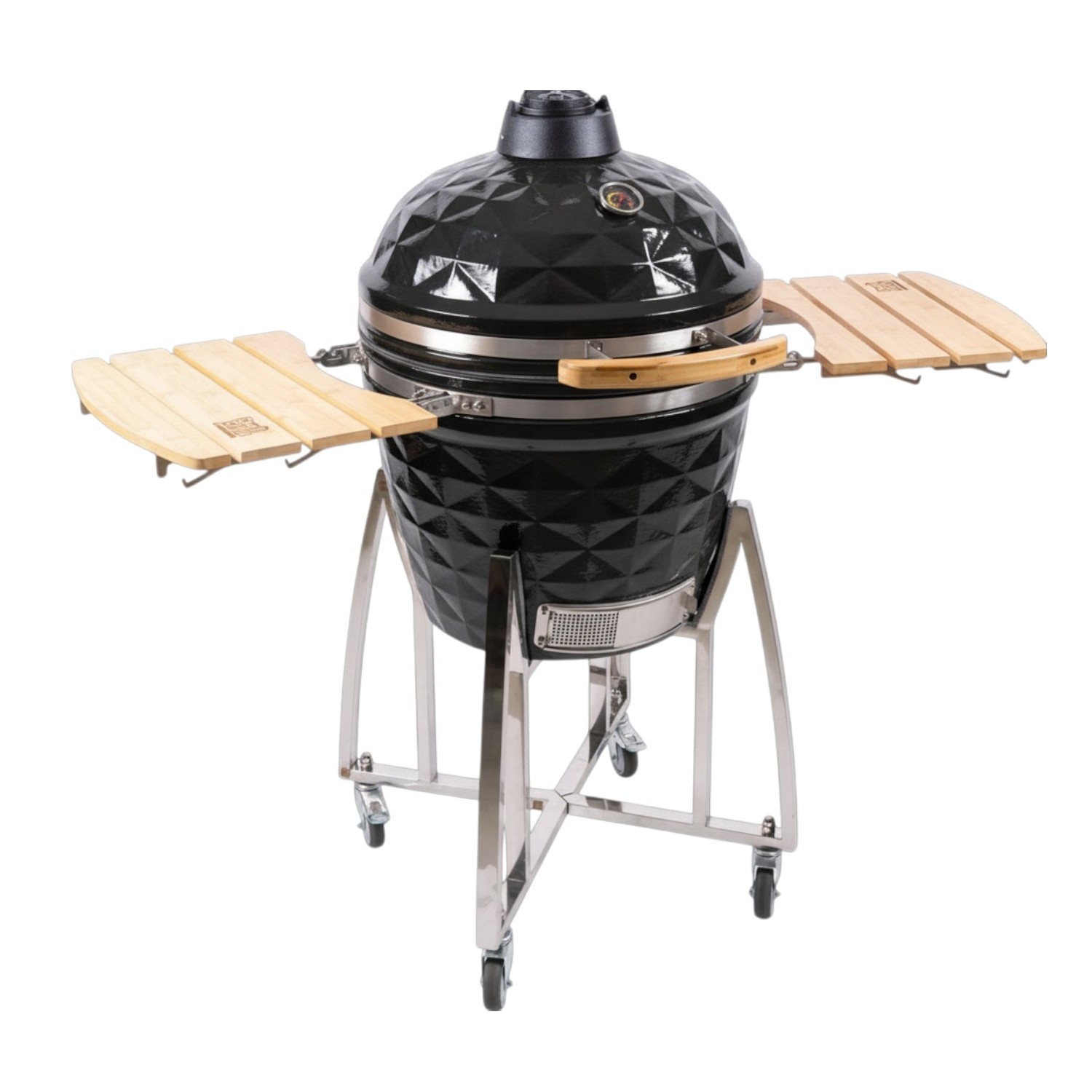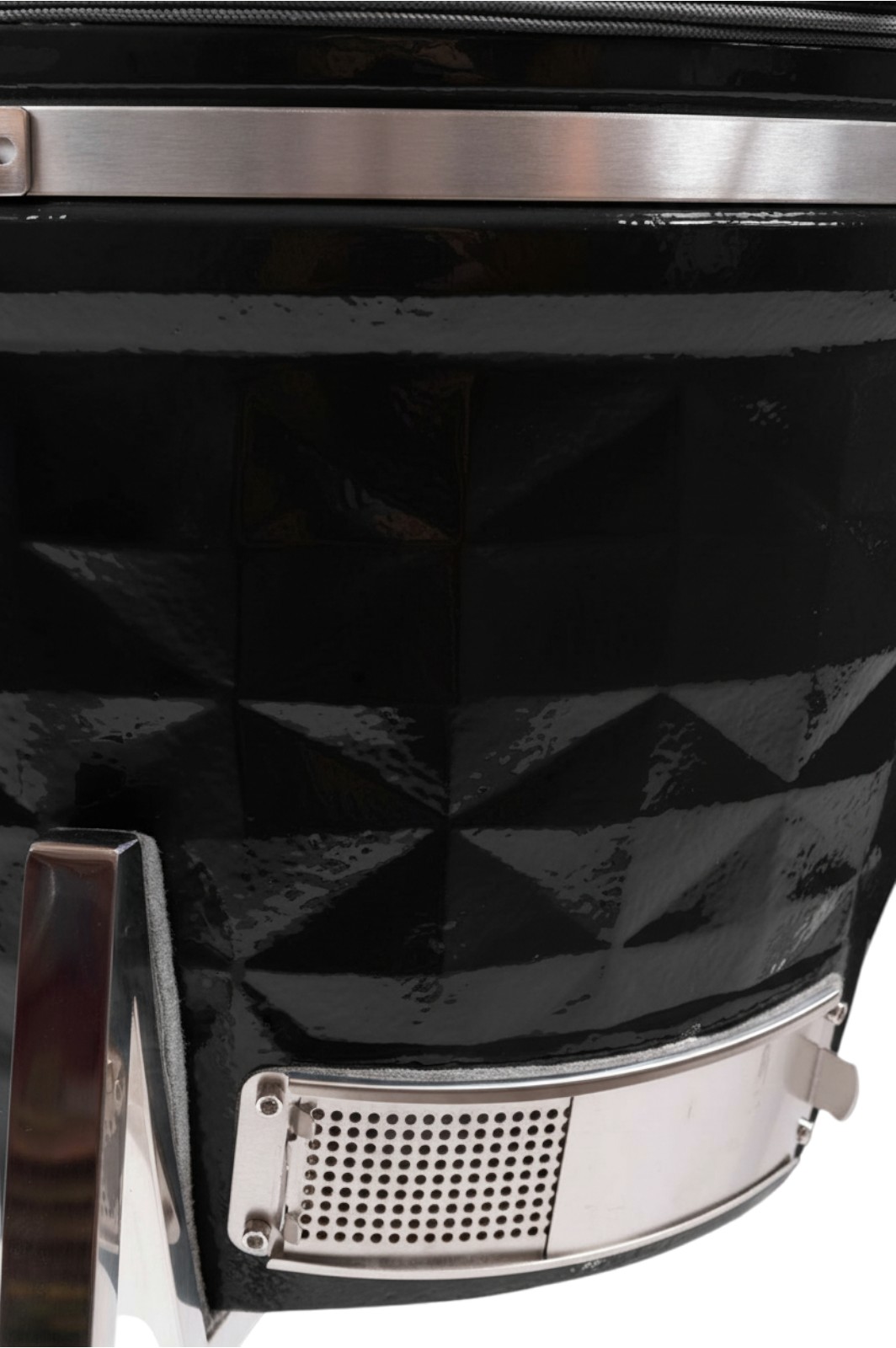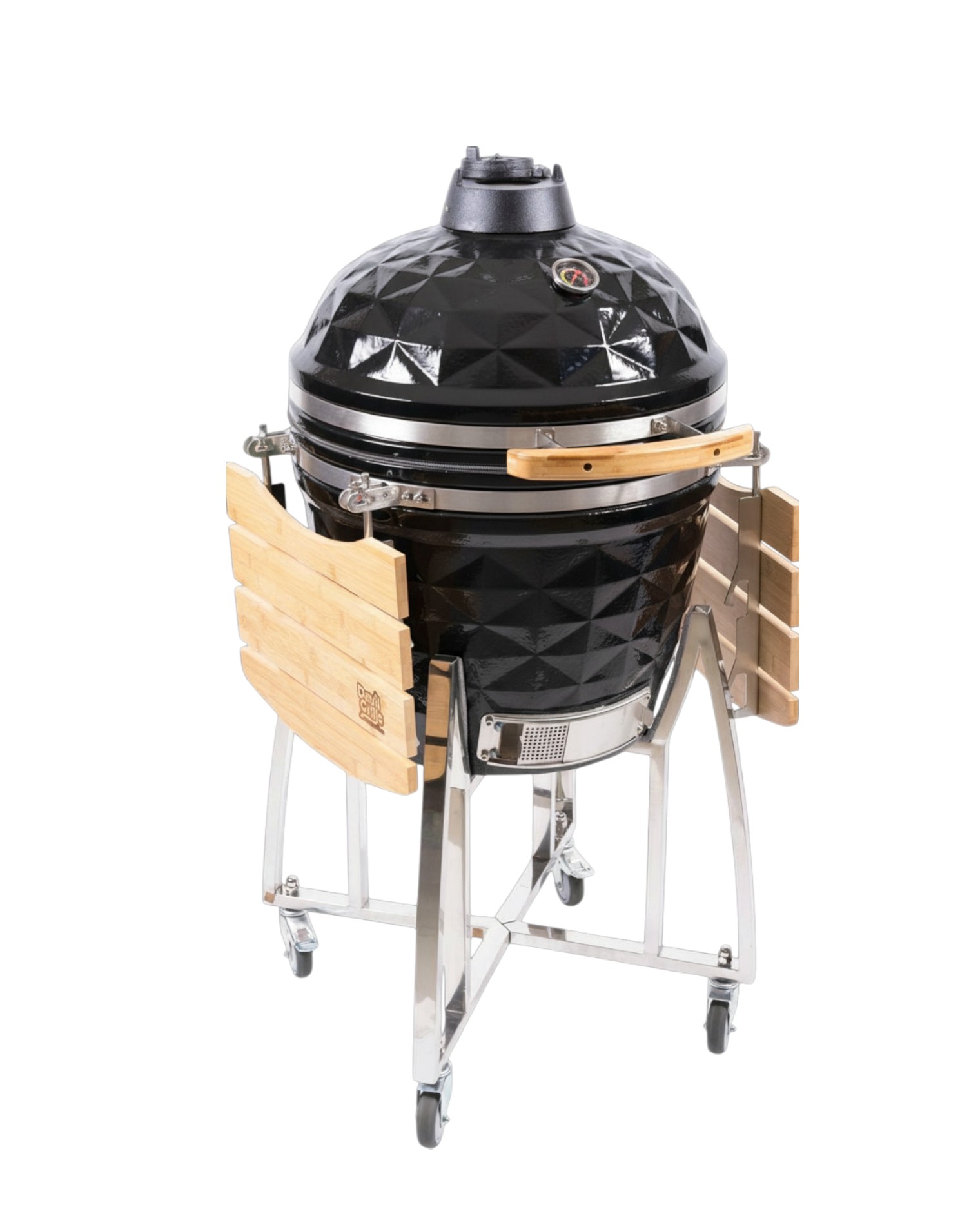 Todos los elementos metálicos son de acero inoxidable lo que permitirá usarlo tanto en la ciudad, el campo o en la playa. Al mismo tiempo le dará un acabado de primera calidad y gran elegancia. Cada kamado incluye una funda de lona de alta resistencia para protegerlo de la lluvia, pinzas para tomar la parrilla cuando está caliente, atizador para retirar las cenizas que se depositan en el fondo, 2 medias lunas de cerámica que te permitirán lograr cocción indirecta usando toda la superficie de la parrilla, un smoker que te permitirá agregar chips ahumadores directamente al carbón. Por último, te entregaremos dos medias lunas de parrillas para cocinar a distintos niveles con nuestro accesorio “Divide & Conquer”